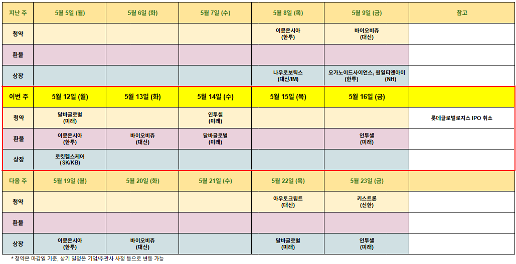 롯데글로벌로지스 IPO가 수요예측이 좋지 않아 취소되었습니다. 기대감은 없더라도 '어쨌든 대어'인 종목이 빠져서인지, 금주는 갑자기 청약이 2건으루 줄어들면서 한산한 느낌입니다.