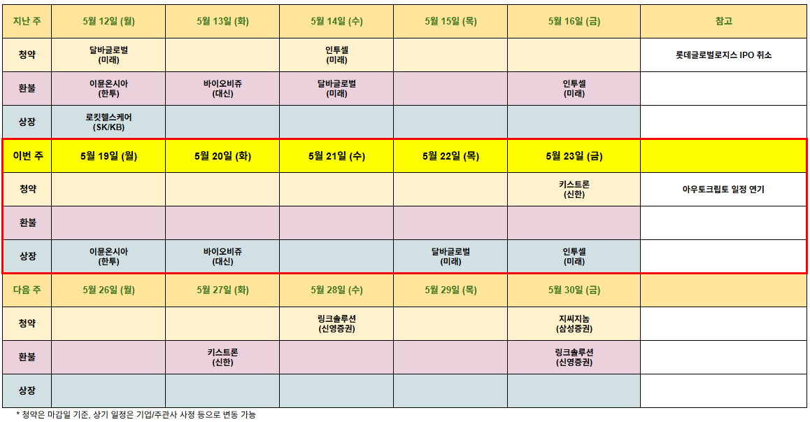 - 금주 청약 예정인던 아우토크립토가 신고서 정정으로 일정 연기되었습니다 (5/20일 > 6/17일)