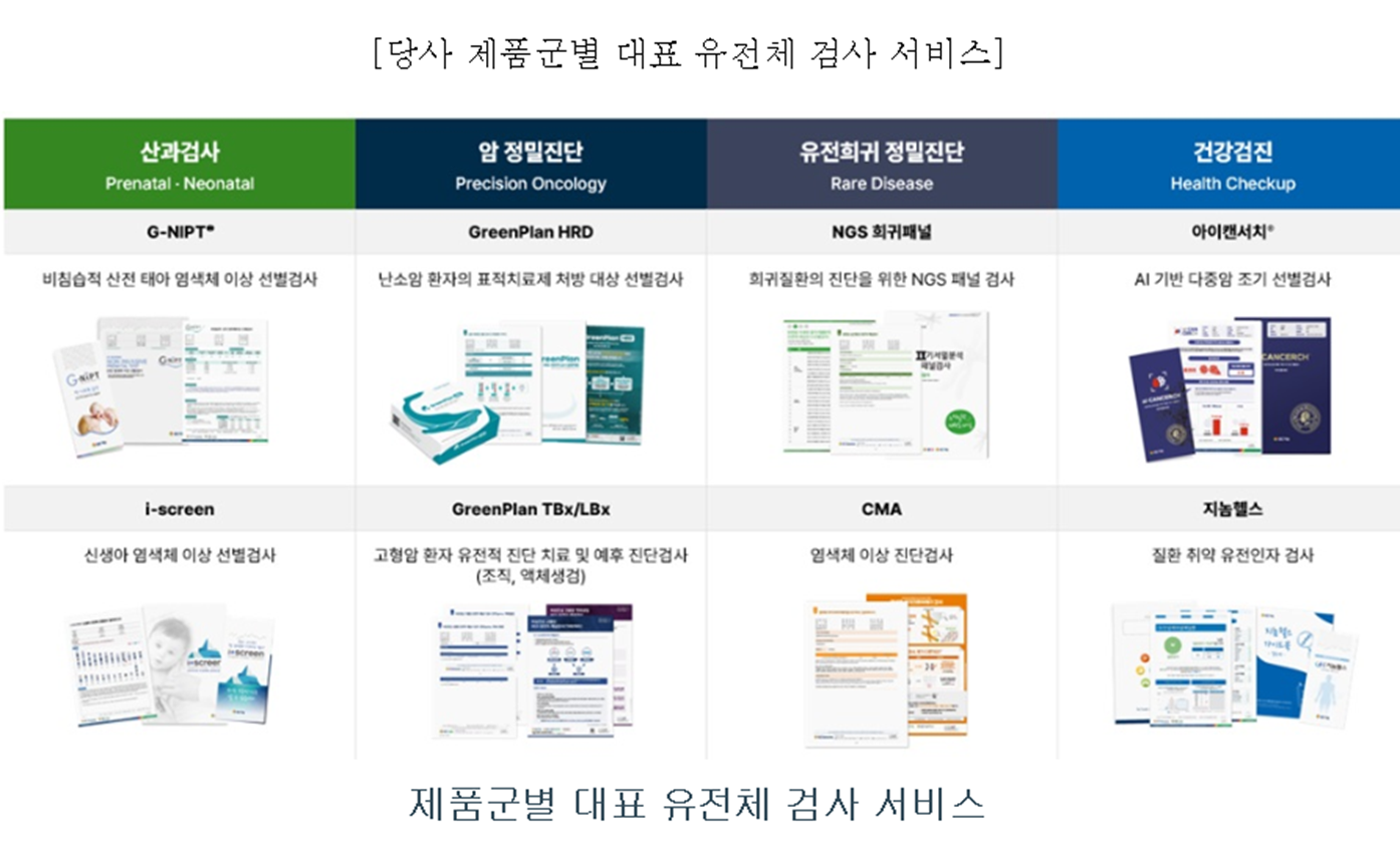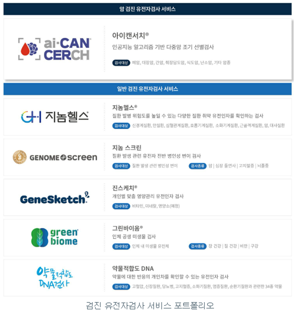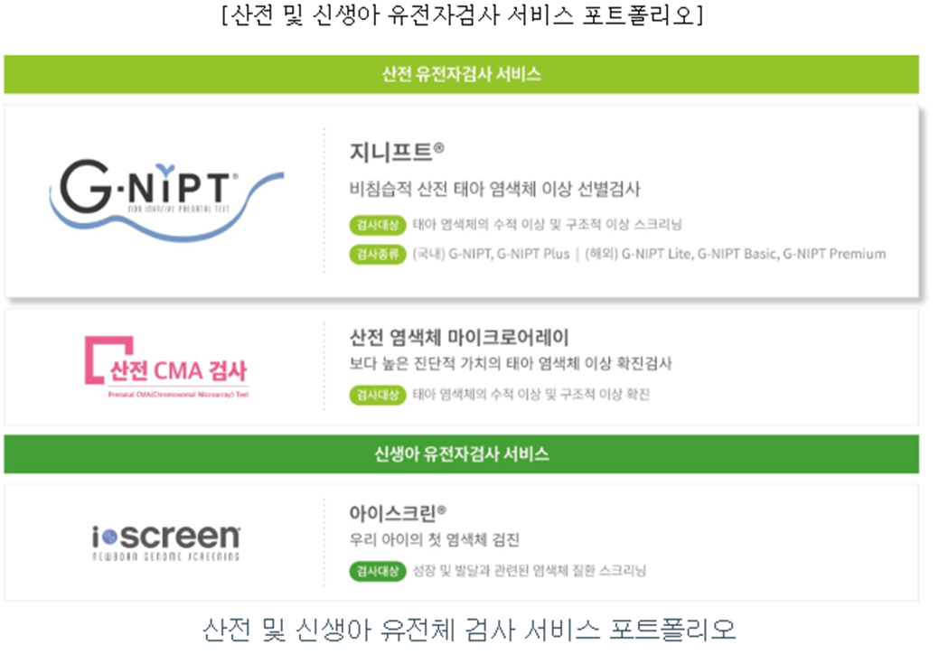 - 제품 서비스: G-NIPT, 아이캔서치 등 300개 이상의 유전체 검사 서비스