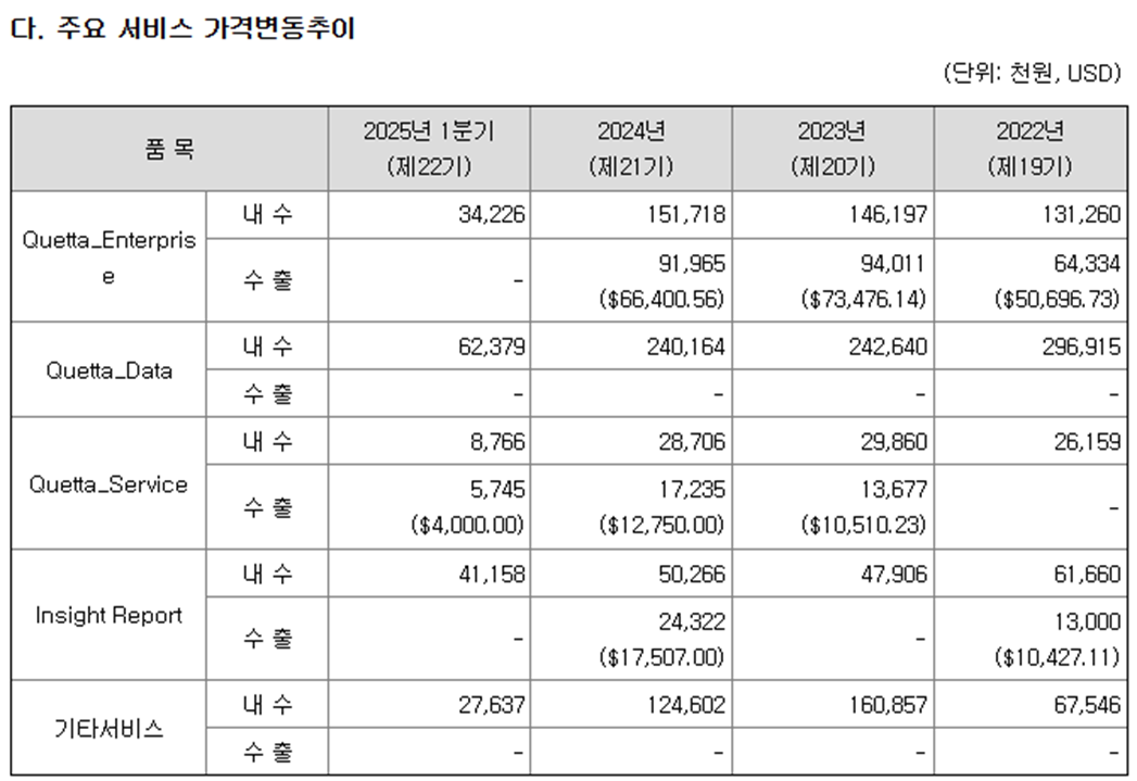 1. 사업내용 - AI 기반 빅데이터 분석 및 검색 솔루션 제공 - 생성형 언어모델, 멀티미디어 분석, 예측 AI 등 적응형 AI 기술 개발 - 주요 서비스: Quetta(빅데이터 분석 플랫폼), Quetta_Human(생성형 AI 기반 개인비서), Quetta_MultimediaAnalysis, Quetta_Predict, Quetta_ESG, Quetta_Market Lens - 국내외 기업 대상으로 시장 분석, 트렌드 예측, 경쟁사 분석, ESG 분석 등 데이터 인사이트 제공 - AI 인프라(고성능 GPU, CPU) 확보 및 연구개발 인력 확대
