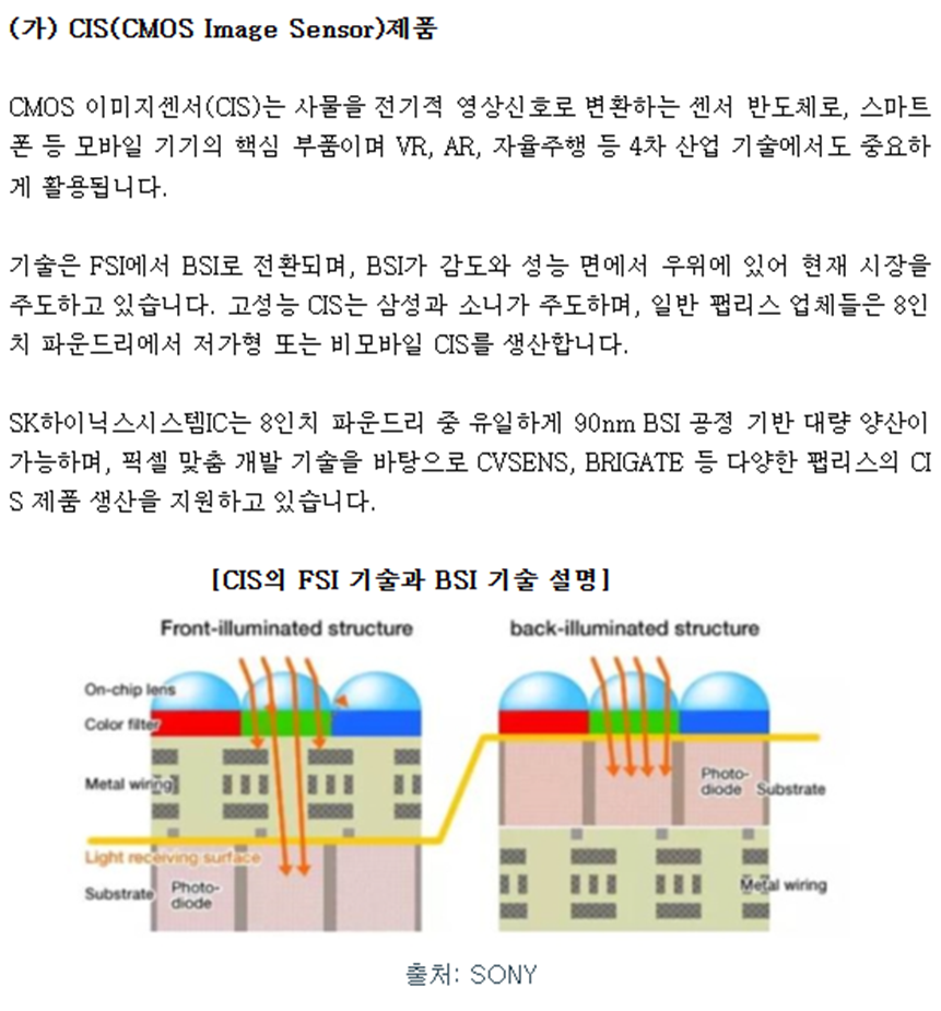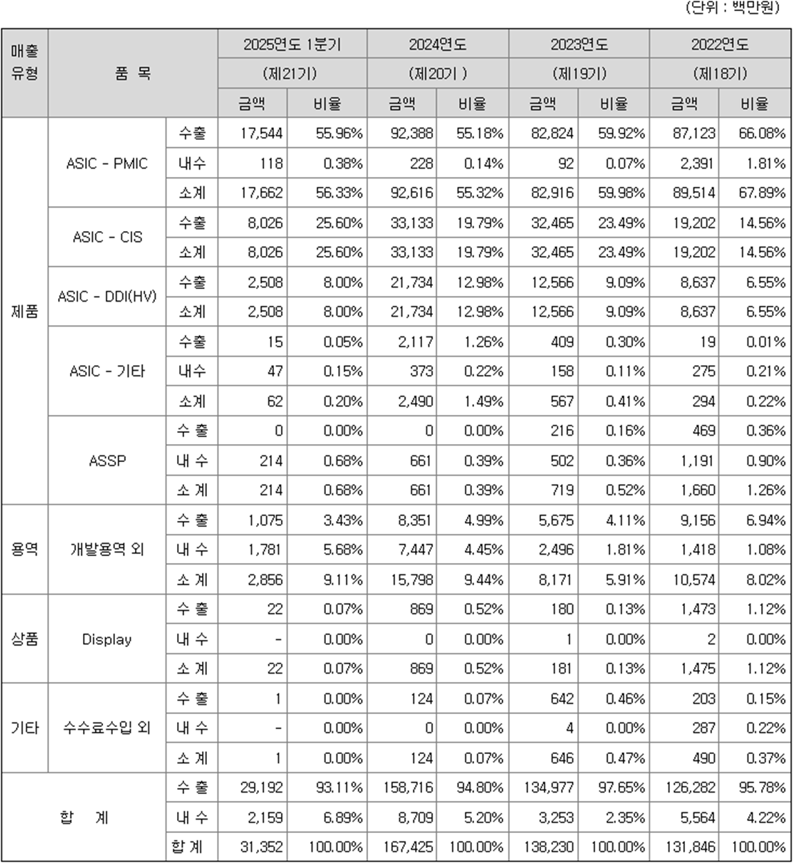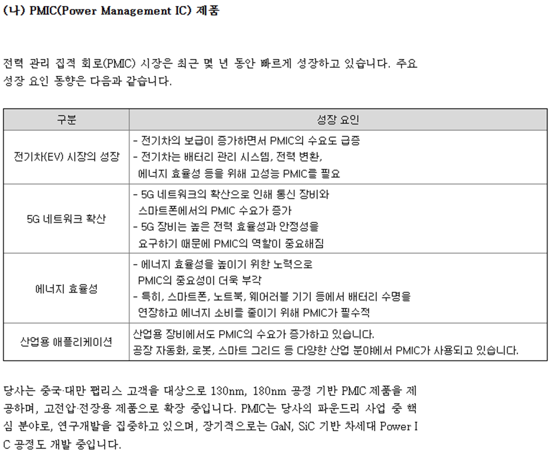 1. 사업내용 - 팹리스 기업 대상 시스템반도체 디자인 솔루션 제공 - 반도체 설계(디자인하우스)에서 파운드리(생산 위탁)까지 전 과정 지원 - SK하이닉스시스템IC(중국 우시) 등과 파트너십, 대만·중국 팹리스 고객 중심 - 8인치 CMOS 기반 PMIC, CIS, DDI 등 다양한 어플리케이션 개발 - 센서(특히 SWIR, MEMS 마이크로폰) 신사업 진출 및 12인치 파운드리 포트폴리오 확대