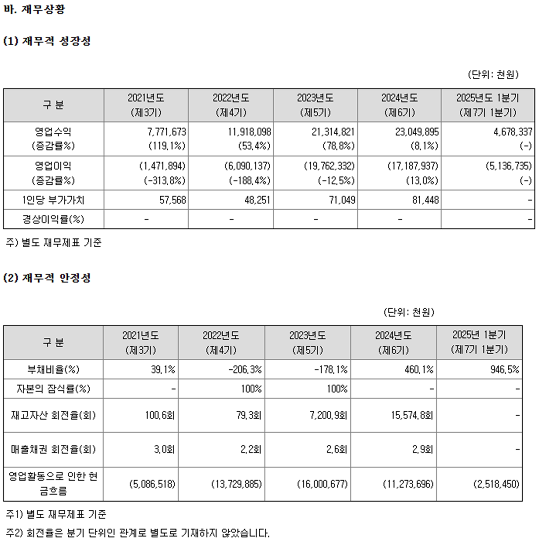 2. 매출현황 - 2024년 매출: 23,050백만원(별도 기준, 성장 지속) - 2025년 1분기 매출: 4,678백만원(전년 동기 3,560백만원 대비 증가) - 해외매출 비중: 북미, 유럽, 중국 현지법인 및 JV 통한 글로벌 매출 확대 중 (해외 비중 증가) - R&D 현황: 24년 기준 인건비 및 연구개발비가 영업비용의 약 60%. - 손익구조: 22~24년 지속 영업적자(2024년 영업손실 -17,188백만원), 26년 흑자전환 목표