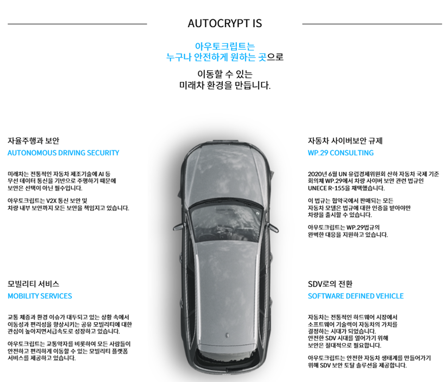 1. 사업내용 - 주요 사업: 자율주행 및 커넥티드카 보안 솔루션, V2X(차량-사물통신) 보안, 차량용 보안 인증 모듈, 차량 테스팅 등 지능형 모빌리티 보안 기술 개발 및 공급 - 특징: 자동차 산업 내 초기 단계인 차량용 사이버보안 시장의 선도적 진입자. UNECE UN-R155, R156 등 글로벌 인증 대응 솔루션 제공. 유럽, 북미, 중국 등 글로벌 시장 진출 중 - 신규사업: 2024년 네덜란드 RDW로부터 유럽 자동차 사이버보안 평가기관(TS) 자격 획득, 아시아-태평양 최초 및 유일 TS 자격 보유, 인증 사업 확대 추진