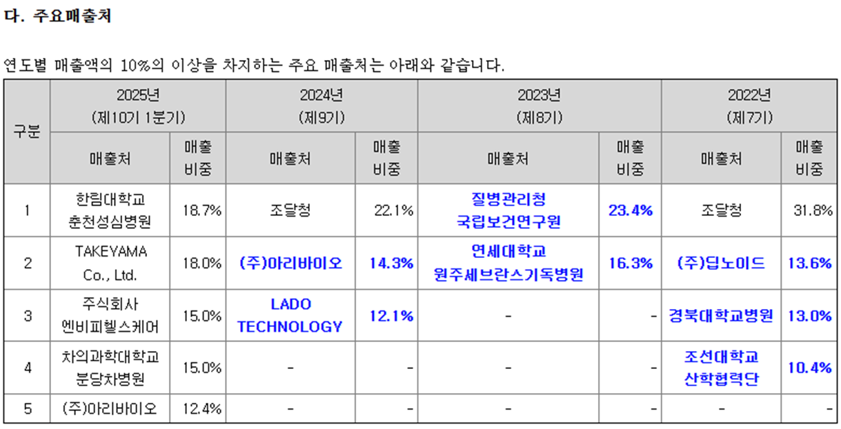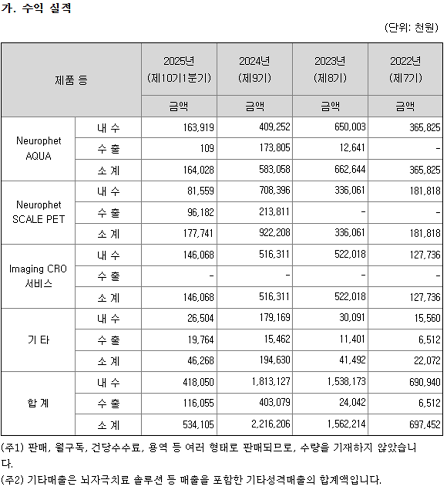 2. 매출현황 - 2025년 1분기 영업수익: 534백만원 - 2024년 연간 영업수익: 2,216백만원 - 해외매출 비중 점진적 확대, 해외 인허가 및 파트너십 추진 - 최근 3년간 영업손실 지속, 결손금 증가 - 연구개발비: 25년 1분기 1,517백만원(영업수익 대비 284%), 2024년 5,987백만원 - R&D 중심 경영, 신제품 개발 및 기술 고도화