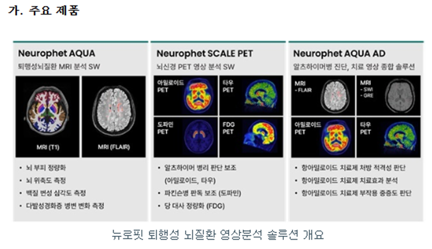 3. 주요제품 - Neurophet AQUA AD: 알츠하이머 진단용 뇌영상 분석 소프트웨어 - Neurophet tES LAB: 뇌 자극 치료 설계 솔루션 - Neurophet SCALE PET: PET 영상 기반 뇌질환 진단 소프트웨어 - Neurophet SegPlus: MRI 기반 뇌영상 자동분할 솔루션 - 글로벌 의료기관 및 제약사 대상 공급 확대