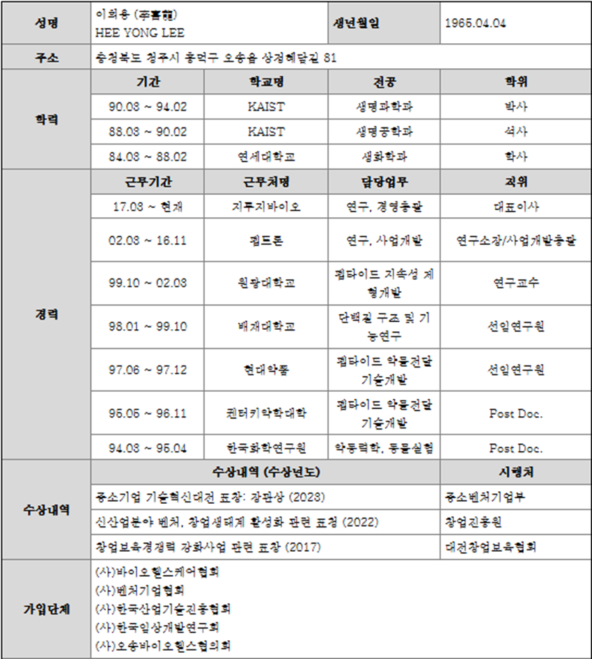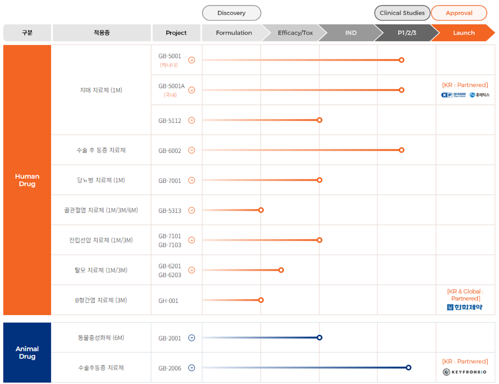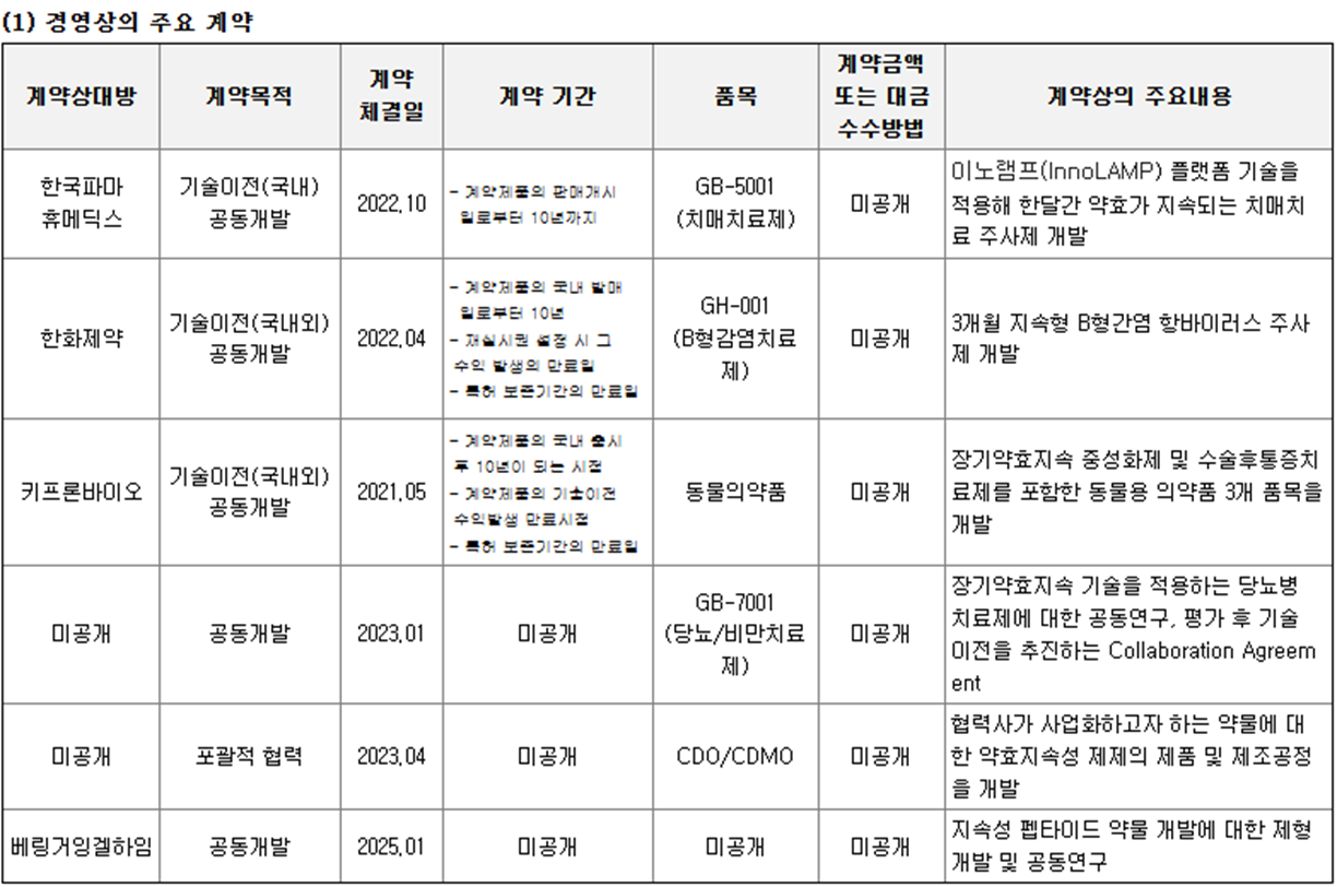 - 주요 기술·제품군 : 약효지속성 미립구 기반 서방형 의약품, GB-5001 (치매치료제), GB-7001 (당뇨·비만 치료제)