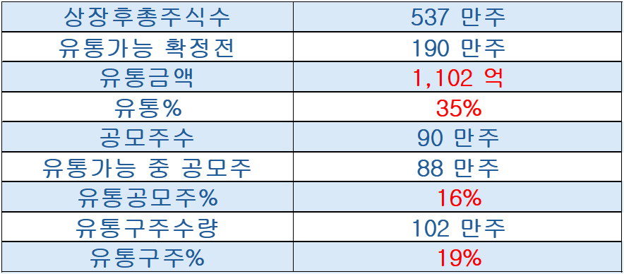 총 상장예정주 537만주 중 35%인 190만주가 상장일 유통되며,  금액으로는 1,102억입니다.