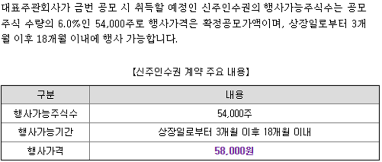 공모가는 상단인 58,000원으로 결정되었고, 확약물량은 15.6%입니다.