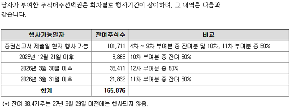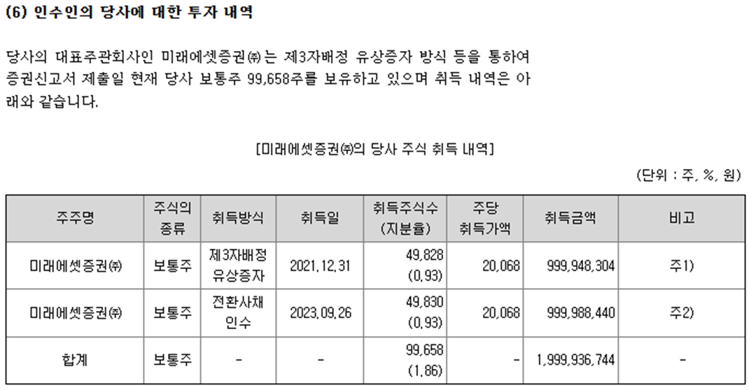 - 희석/위험 요인 (인수인의 투자내역, 주식매수선택권, 신주인수권, 소송 등)