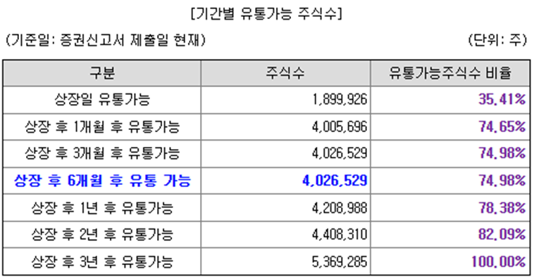 상장 후 1개월 후 약 39% 물량이 추가로 락업해제되며, 총 75% 물량이 1개월만에 유통되는 구조입니다.
