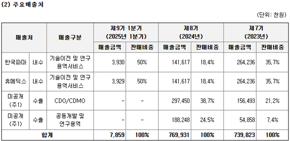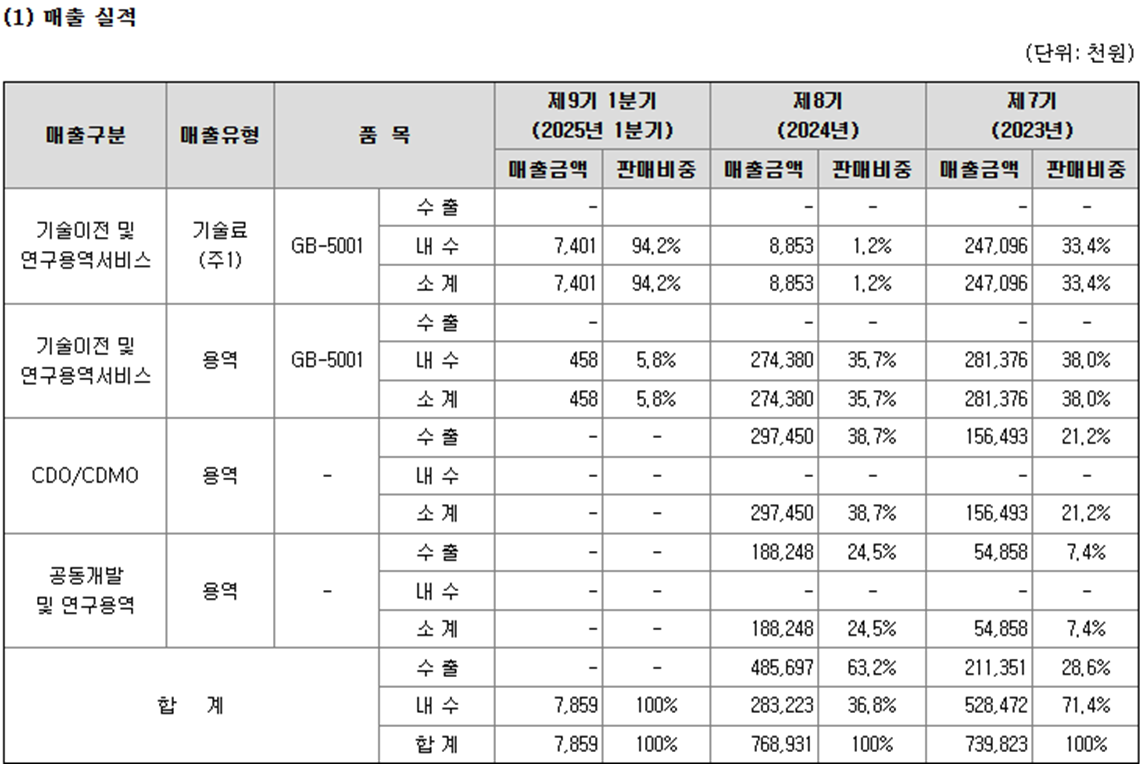 - 서비스 : 기술이전(선급금·마일스톤·로열티 구조), CDO/CDMO 용역, 공동연구 및 임상개발 지원