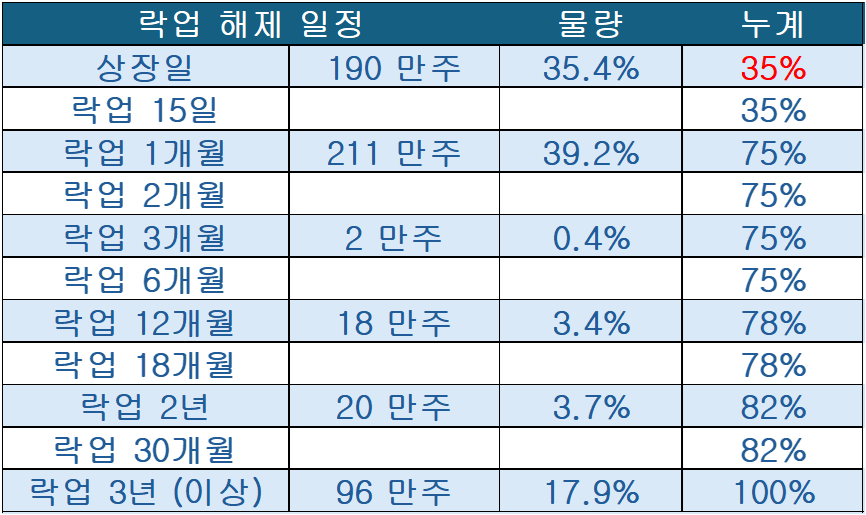(상장일 35% 유통 + 1개월 후 약 39% 물량 폭탄)