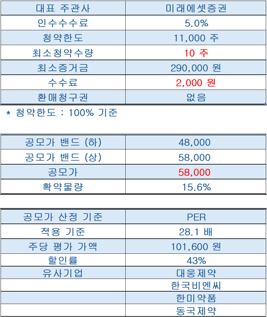주관사는 미래에셋증권이며, 최소 청약은 10주로 증거금은 290,000원입니다.