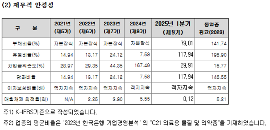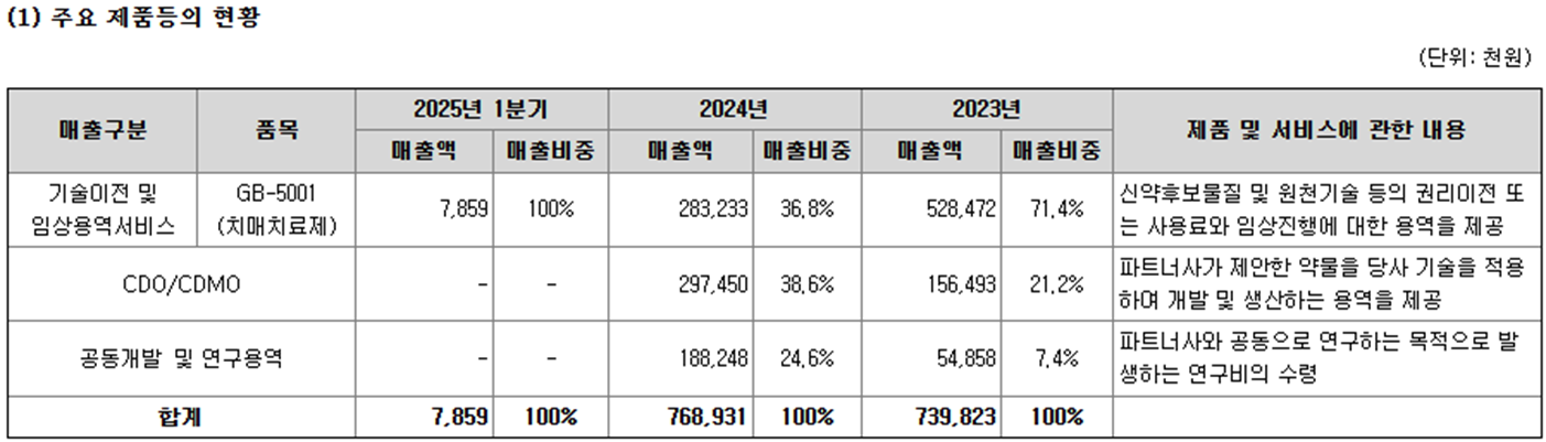 - 2025년 1분기 매출: 7.9억 원(대부분 GB-5001 치매치료제 기술이전)