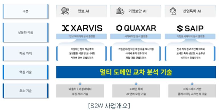 1. 사업내용 - AI·빅데이터 기반 사이버 보안, OSINT(공개정보분석) 생성형 AI 보안 솔루션 - 국내외 정부·공공기관, 민간기업 대상 데이터/보안 기반 솔루션, SaaS 공급 - 글로벌 시장(일본·싱가포르 등) 진출 진행, 북미·유럽 확장 계획 - 자체 연구조직·AI·NLP 전문가팀, KAIST 등과 공동연구·기술 협력
