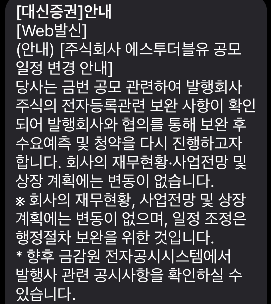 대신증권에서 접수된 공지입니다. 전자등록 절차 상 문제라면 왜 수요예측까지 다시하는지 잘 모르겠네요. 아무튼 청약 접수 당일 취소라니.. 별일이네요