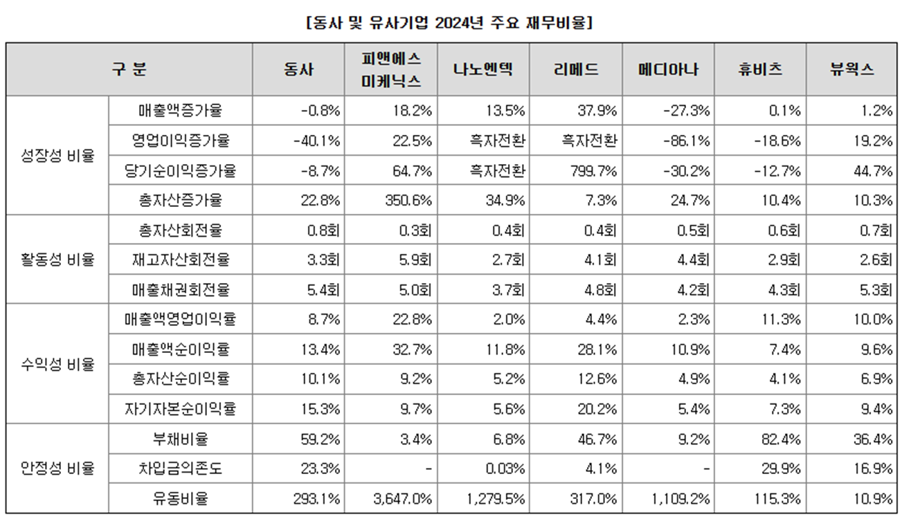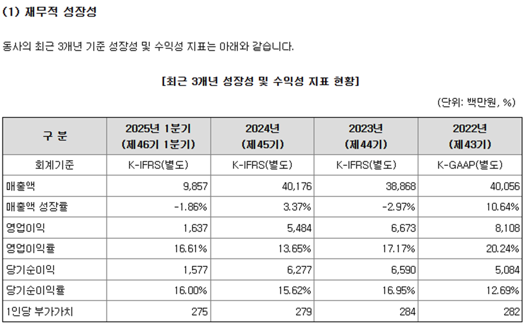 - 최근 3년 매출(2022~2024): 400억→389억→402억 원, 2025년 1분기 95억 원 - 수출비중: 2024년 기준 약83%(특히 미국 시장 18%) - X-ray 그리드(주력 부품) 매출 비중 높음 - 의료영상기기(DeteCT, StriXion 신제품 성장) - 상위 2개 매출처 비중 약30%(고객 다변화) - 연결 종속법인(미국·일본·미국지주사) 운영 / 미국 법인 부분 자본잠식 상태 - R&D : 특허 59건·디자인 9건·상표 19건 등 지적재산 집중(AI·영상분석 신제품) - 최근 영업이익 하락(판관비 증가, 신시장 진출비용 등)