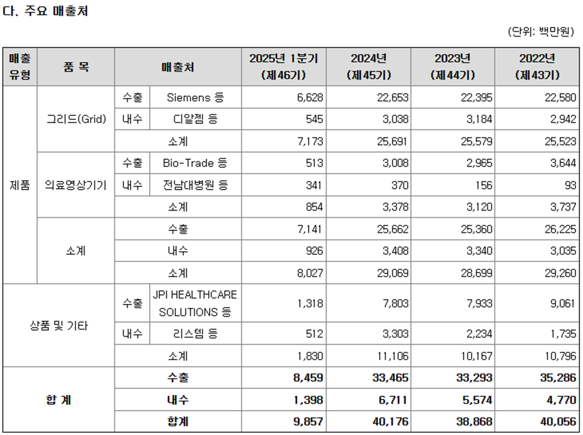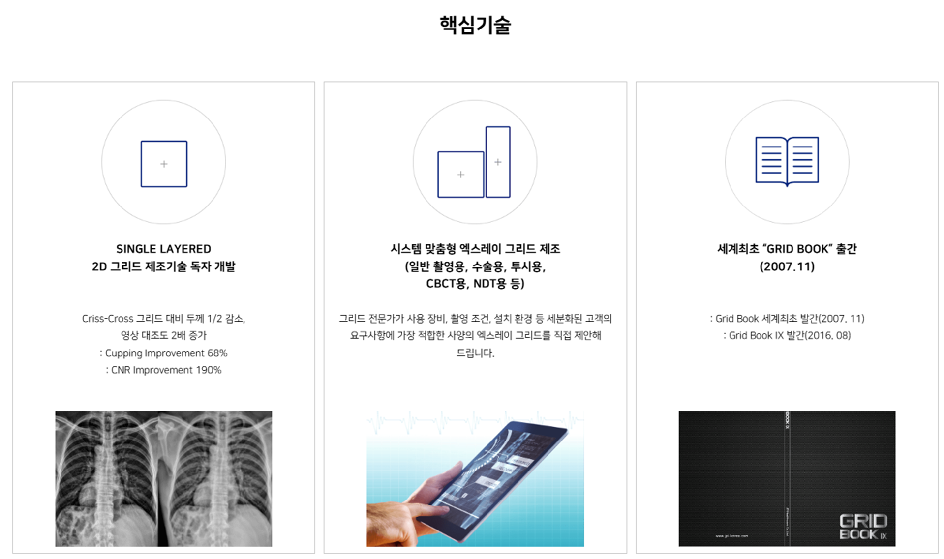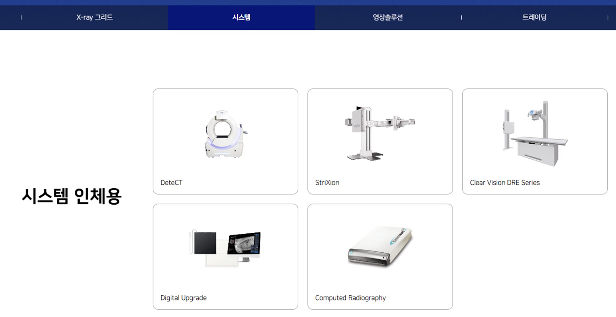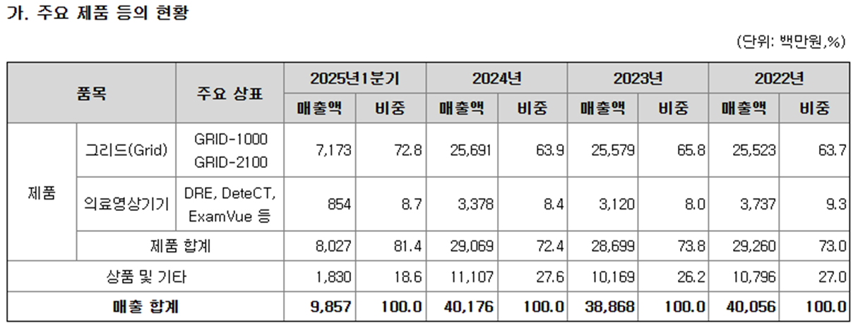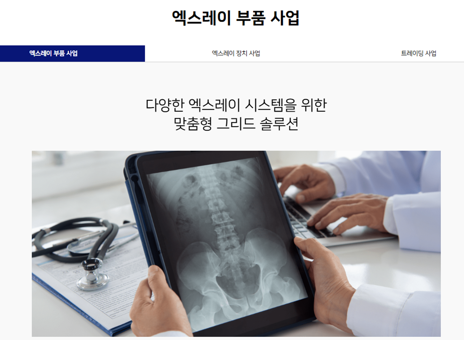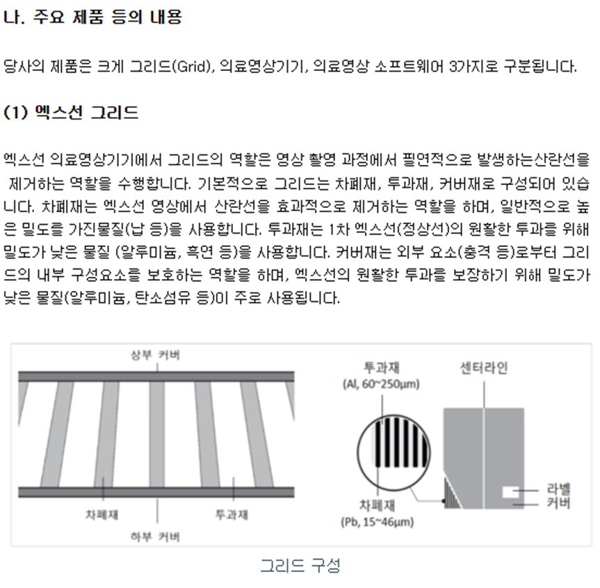 1. 사업내용 - 엑스선(X-ray) 기반 핵심 부품 및 의료 영상기기 개발·제조 전문 - X-ray 그리드(산란선 제거용 정밀부품) 자체 개발·생산 - 의료용 엑스레이 시스템(DeteCT, StriXion 등) 완제품 생산·공급 - 제품 개발~설계~생산~품질~납품까지 전공정 자체 수행(자체 공장 보유) - 주력 시장: 글로벌(수출 비중 약83%), 미국·유럽·일본·중남미 현지법인 운영 - 의료영상 AI 솔루션, 영상획득 소프트웨어 등 다양한 확장 제품 개발 - 국내외 300여 개 의료기기 기업·병원 등 대리점·법인 통해 공급