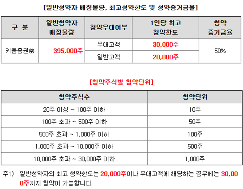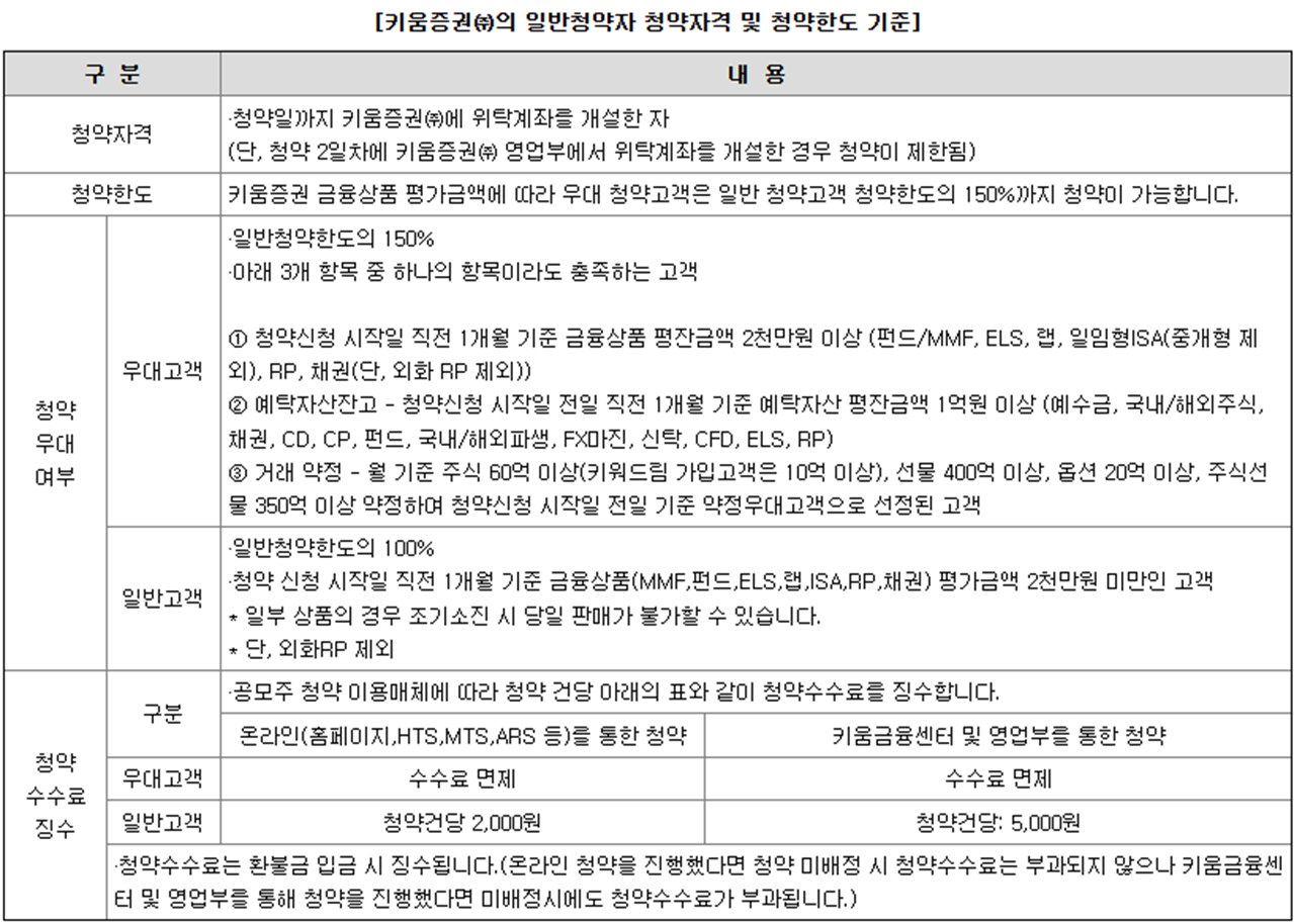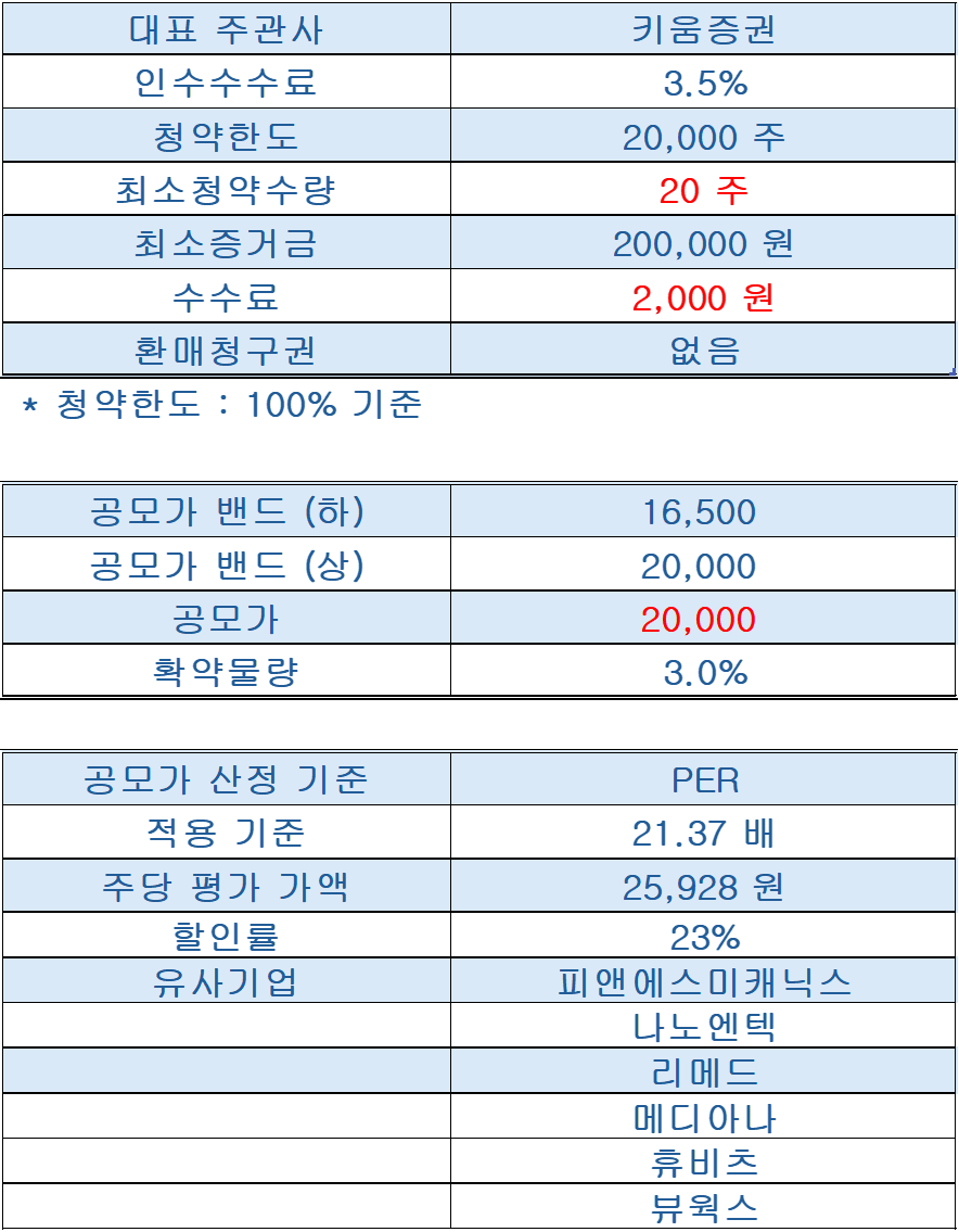 주관사는 키움증권이며, 최소 청약은 20주로 증거금은 200,000원입니다. 수수료는 2,000원입니다.
