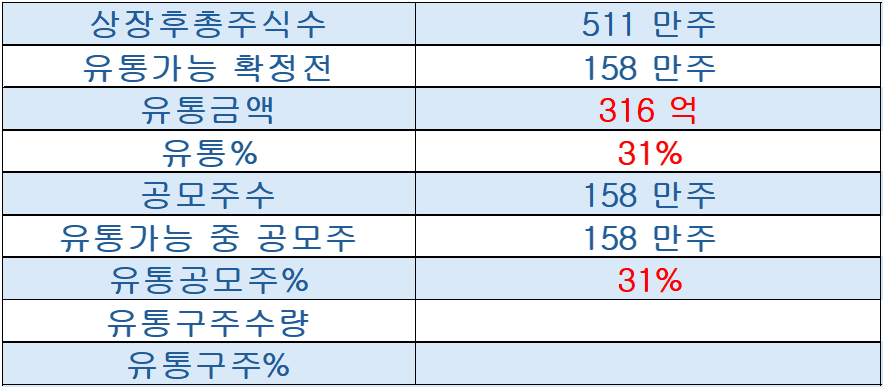 총 상장예정주 511만주 중 31%인 158만주(316억)가 상장일 유통됩니다. 유통물량 30.9%는 공모주로만 이루어집니다.