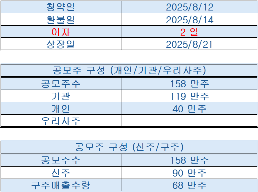 공모가는 상단인 20,000원으로 결정되었고, 확약물량은 3.0%로 낮은 수준입니다. PER 21배로 산정된 가격에, 할인율 23% 적용된 공모가입니다. 8월 12일 (화) 16시 청약 마감이며, 마통 사용 시 2일 이자 부담이 있습니다. 공모주 상장일은 8월 21일(목)입니다.