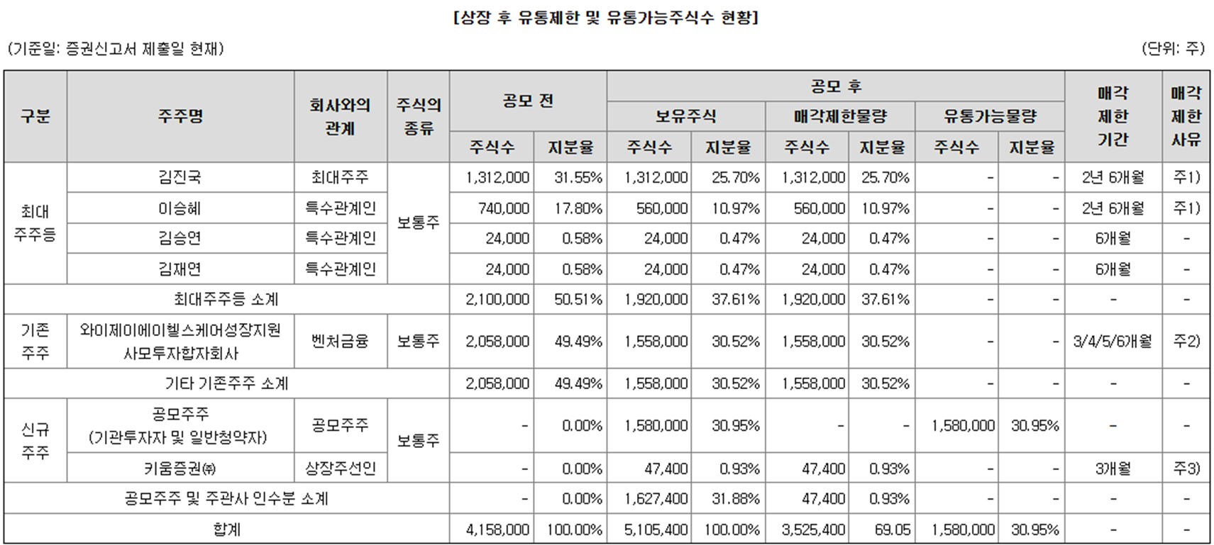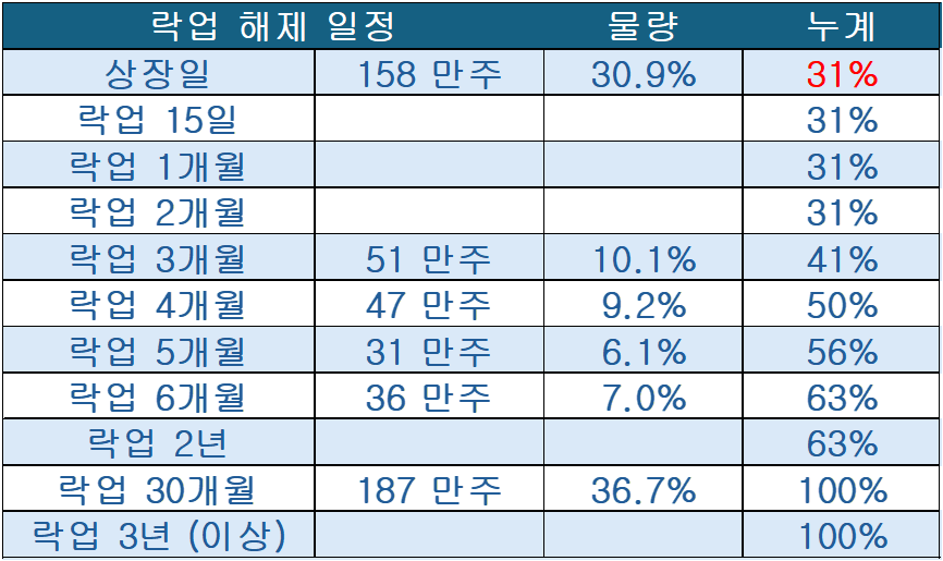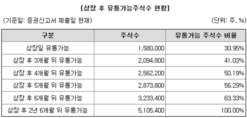상장 후 3개월부터 추가 락업해제가 있으며, 3/4/5/6개월 순차적으로 풀립니다.