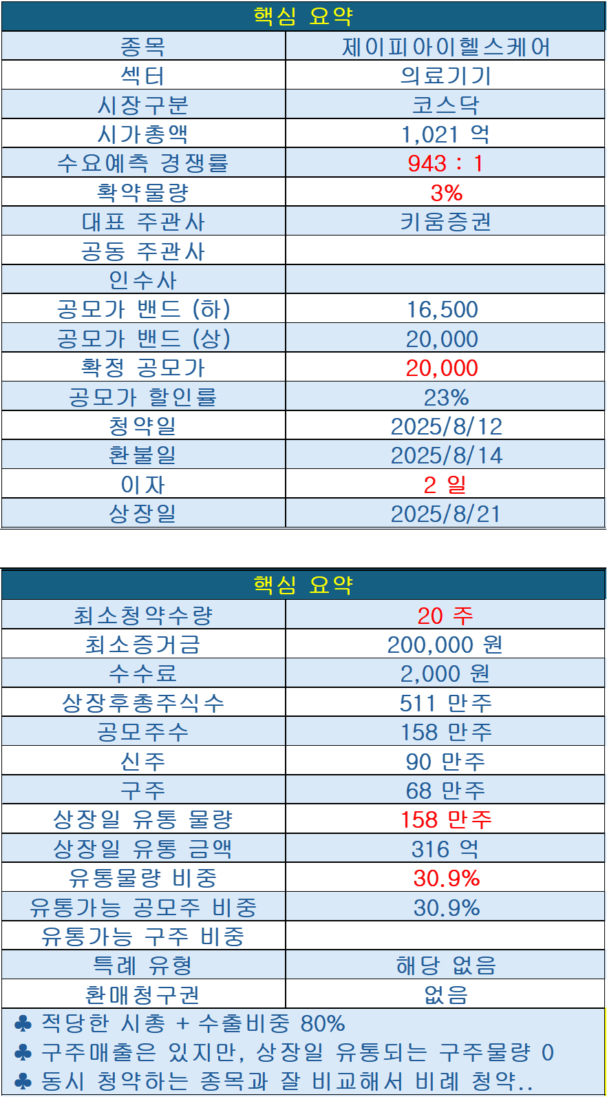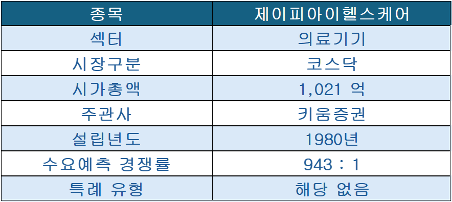 제이피아이헬스케어는 의료 영상기기 관련 기업으로, 1980년 설립되었습니다 시가총액은 공모가 기준 1,021억, 수요예측 경쟁률은 943 : 1 입니다.