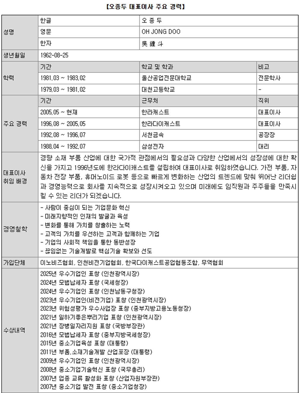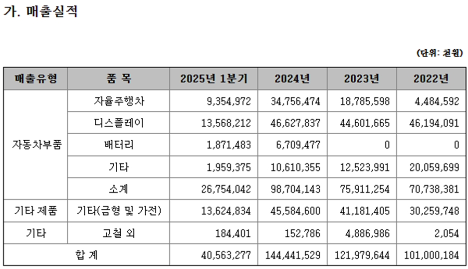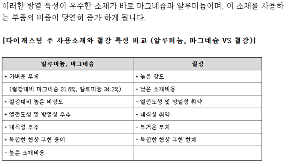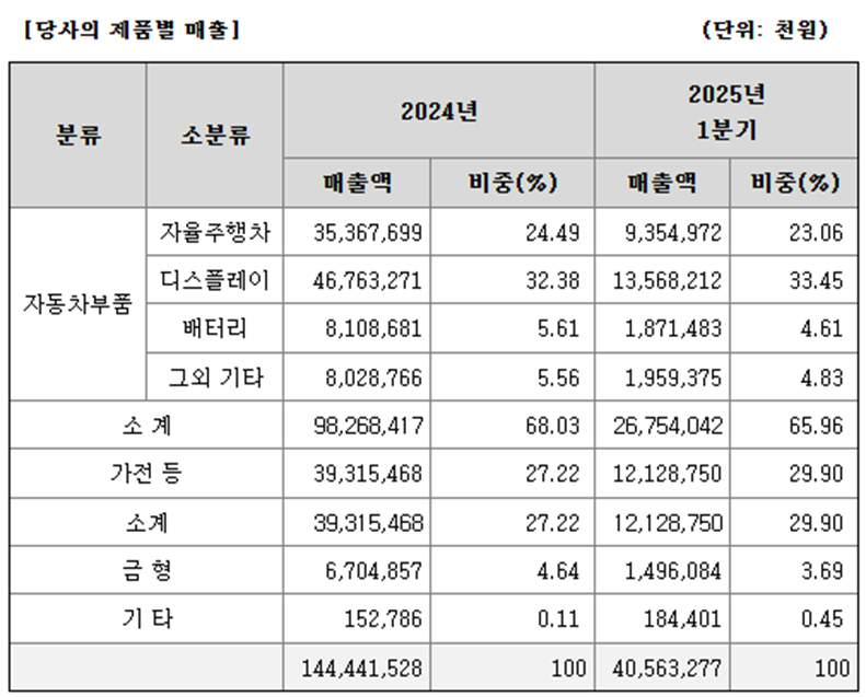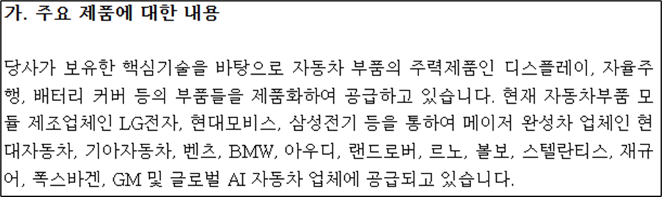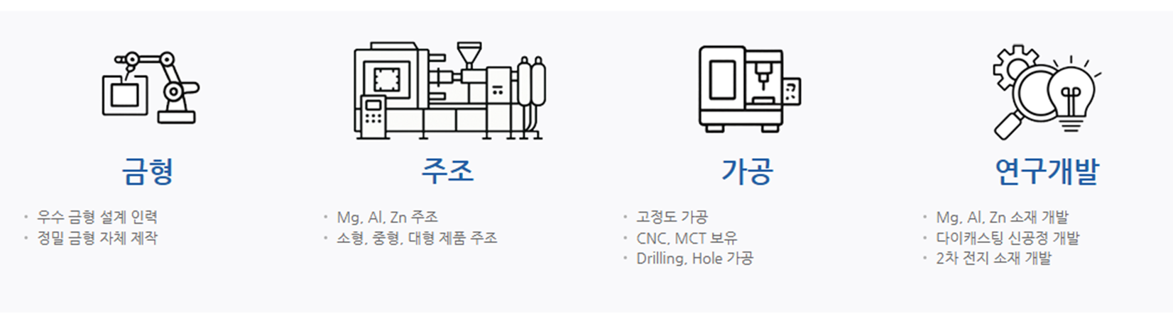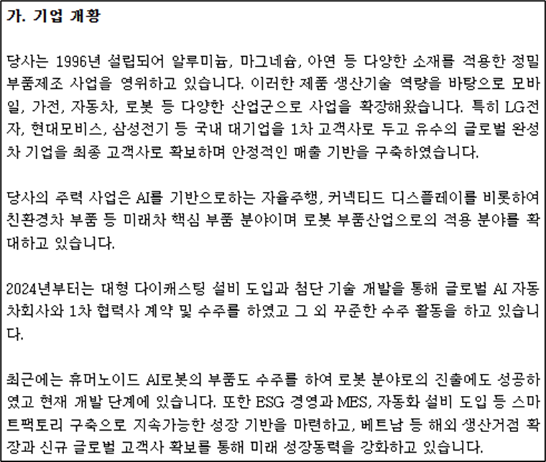 1. 사업내용 - 자동차 경량화 소재 부품(알루미늄·마그네슘 다이캐스팅) 개발 및 제조 전문 - 차량용 커넥티드 디스플레이/자율주행 핵심 부품 생산 - 대형 마그네슘/알루미늄 소재 부품 국내 유일 대형 설비(자체 수직계열화) - 고객사 : 글로벌 완성차·부품사(현대·기아·GM 등) - 친환경·자율주행차·로봇부품·전장화 모듈 등 신규 사업 확대 - 국내·베트남 생산법인 운영, 글로벌 고객 맞춤 개발·생산 서비스