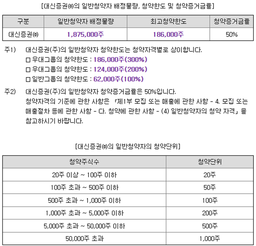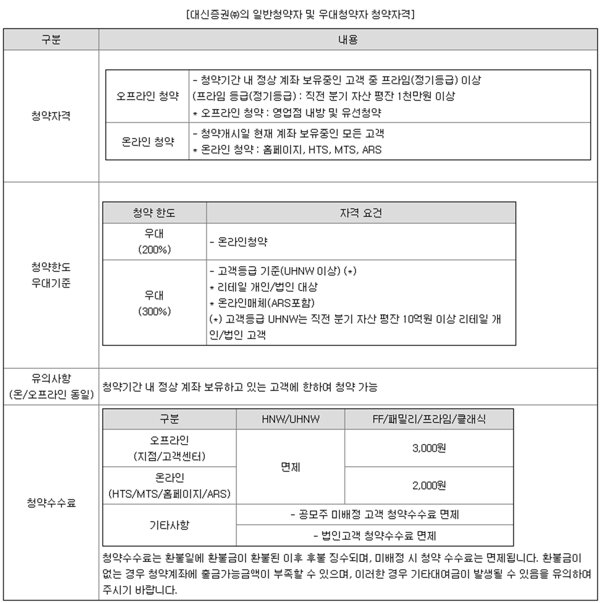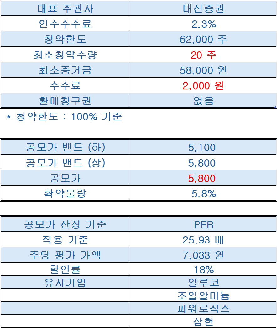주관사는 대신증권이며, 최소 청약은 20주로 증거금은 58,000원입니다. 수수료는 2,000원입니다.