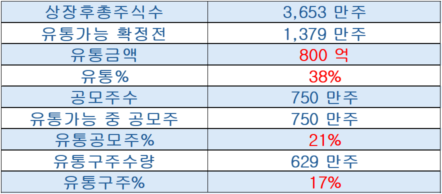 총 상장예정주 3,653만주 중 38%인 1,379만주(800억)가 상장일 유통됩니다. 유통물량 37.8%는 공모주 20.5%와 구주 17.2%로 구성되며, 유통물량 부담이 있는 편입니다.