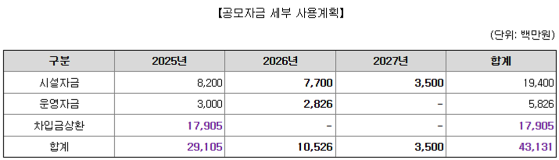 공모를 통해 확보한 자금은 시설자금, 운영자금, 채무상환 용도로 활용됩니다.