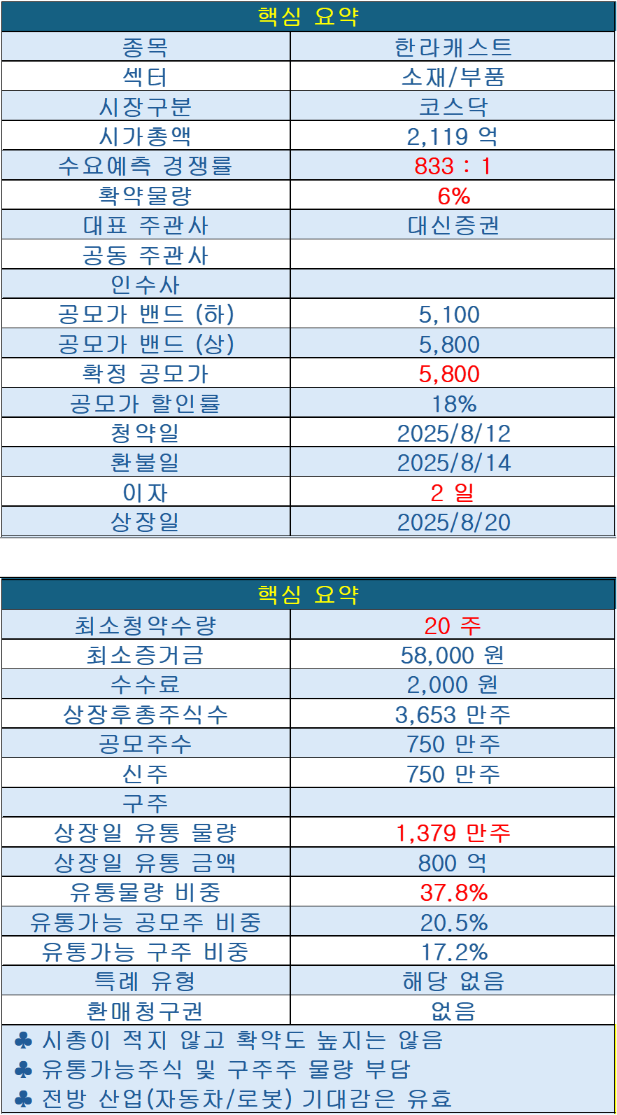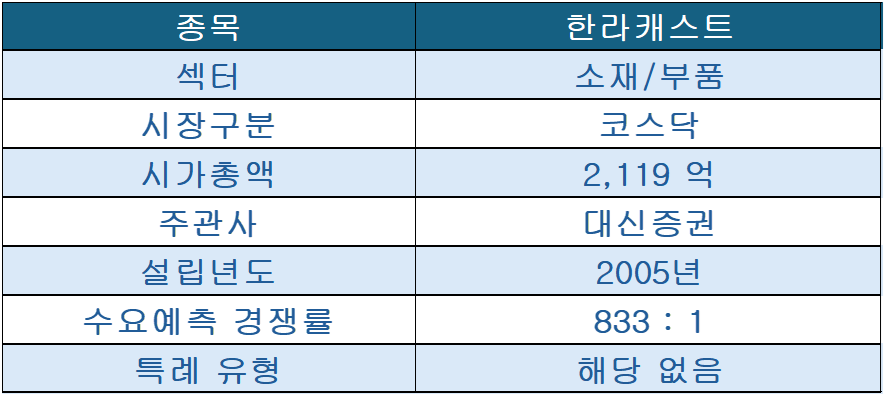 한라캐스트는 경량화 소재/부품 제조 기업으로, 2005년 설립되었습니다 시가총액은 공모가 기준 2,119억, 수요예측 경쟁률은 833 : 1 입니다.