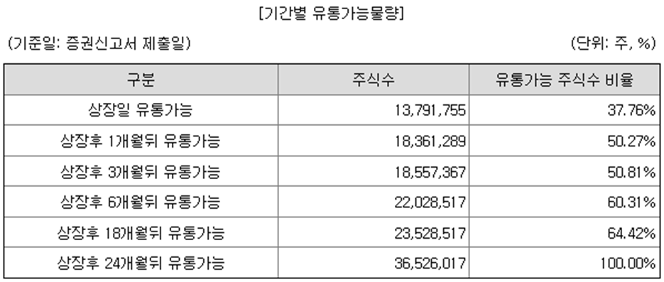 상장 후 1개월 후 약 13% 물량이 추가로 락업해제되며, 총 50% 물량이 1개월만에 유통.
