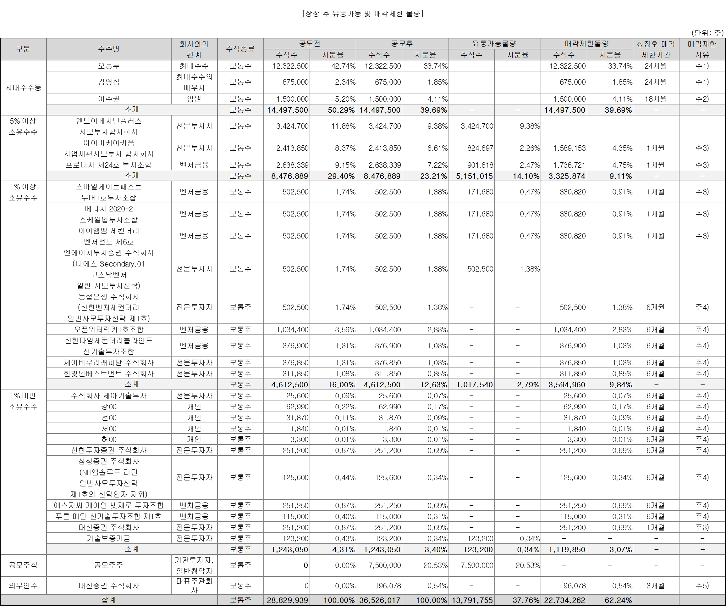 시총도 무거운 편에 확약도 높진않지만, 안정적인 제조기업 느낌이네요. 유통가능주식 및 구주주 물량은 확실히 부담되는 수준입니다. 그래도 전방 산업(자동차/로봇) 기대감은 유효해서, 중장기로는 우상향하길 바랍니다.