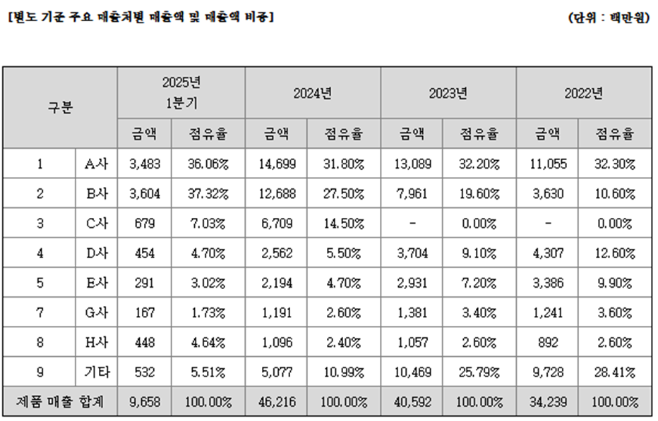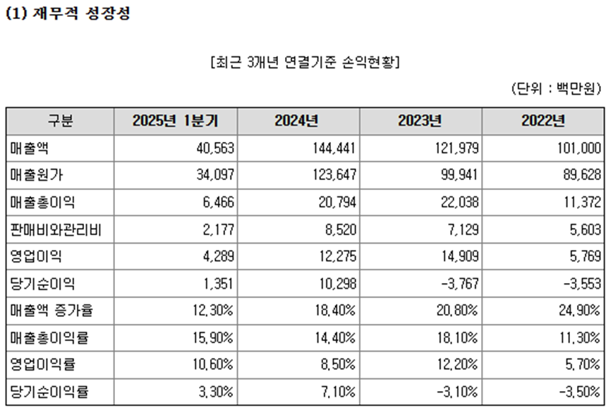 - 최근 3년 매출: 2022년 1,010억 → 2023년 1,219억 → 2024년 1,444억 원 - 2025년 1분기 매출: 406억 원, 2분기 누계 770억 원, 7월 누계 889억 원 - 매출 성장률: 최근 5년 CAGR 20%대, 2024년 기준 영업이익 123억 원 - 주력: 친환경·자율주행부품, 로봇부품, 글로벌 완성차사 직납(2025년 확대 예상) - 수출비중 및 지역: 베트남 등 해외법인 중심, 글로벌 현지 공급망 확대 - 부채비율: 2024년 53%(업계평균 준수) - R&D 현황: 특허 60여건, 사업별 설계·분석·제품 개발 연구 강화