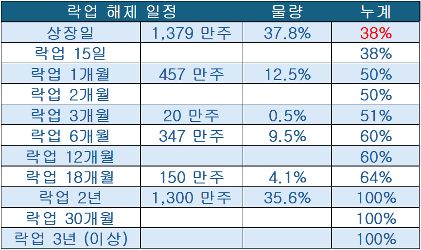 상장 후 1개월 후 약 13% 물량이 추가로 락업해제되며, 총 50% 물량이 1개월만에 유통.