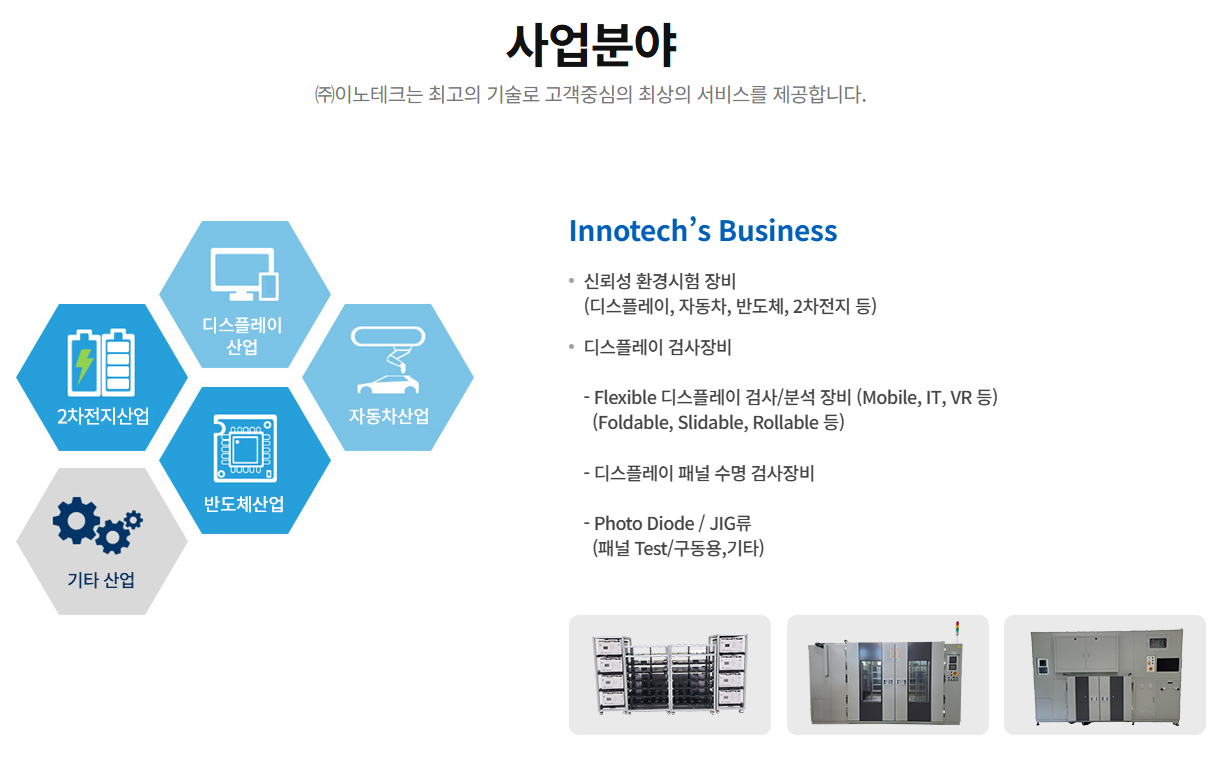 지난번 상장 때부터 이노테크의 주력 제품은 환경시험 장비의 국산화입니다. 설립 초기부터 기술 내재화와 장비 국산화에 집중하며, 과거에 일본 장비에 의존해왔던 환경시험 장비를 국산화한 선구적 기업입니다. 역량을 키워서 이제는 고객 맞춤형 장비 공급부터 납품 후 유지보수까지 토탈 솔루션 제공 역량을 갖춘 기업으로 성장했습니다.