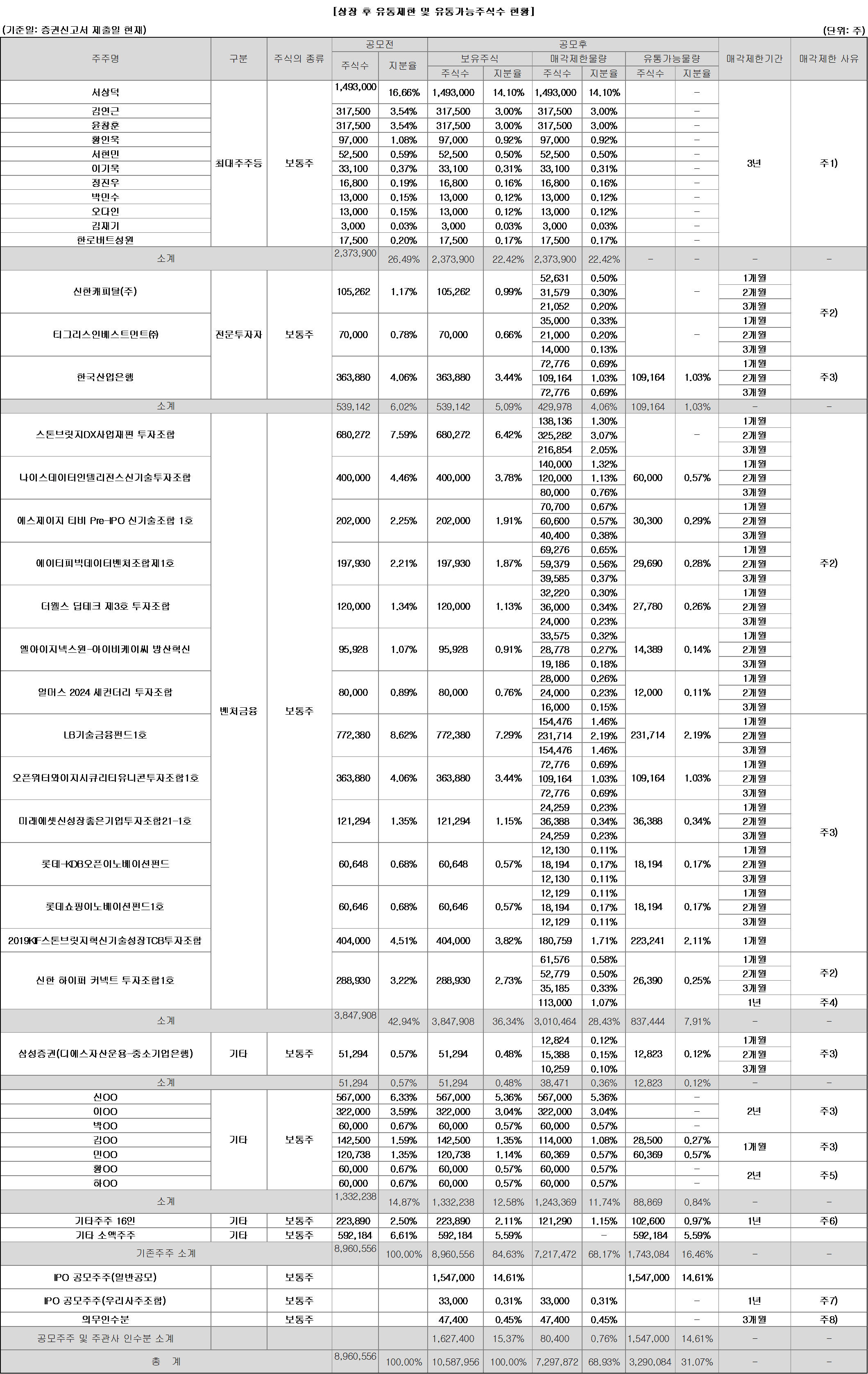상장 후 1개월 후 약 13% 물량이 추가로 락업해제되며, 총 44% 물량이 1개월만에 유통되는 구조입니다.
