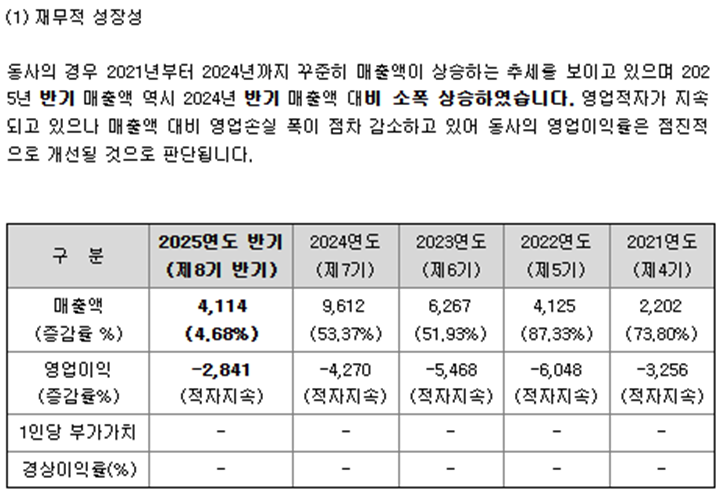 최근 3년 매출: 2022년 41.2억 원 → 2023년 62.7억 원 → 2024년 96.1억 원(연평균 63.5% 성장), 2025년 1분기 21.7억 원
