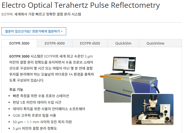 대표 제품으로는 TeraPulse 4000과 EOTPR 3000이 있습니다. TeraPulse 4000은 0.06 THz~5.0 THz 스펙트럼 범위에서 90 dB 이상의 동적 범위를 제공하는 분광기이며, EOTPR 3000은 플립칩, 패키지 온 패키지(PoP) 등 고급 패키지의 상호연결 결함을 식별·분리하는 전기광학 테라헤르츠 펄스 반사계다.