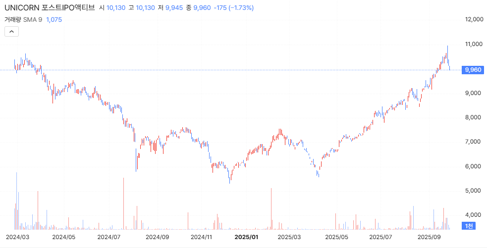 아래는 UNICORN 포스트IPO 액티브의 일봉차트입니다.
