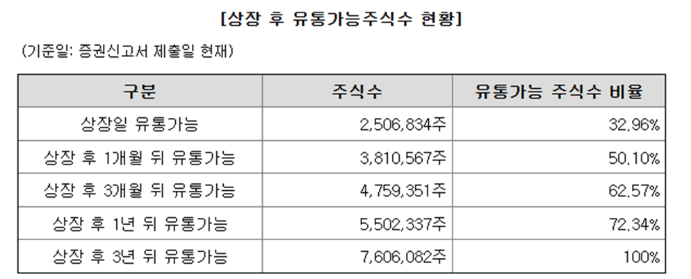 상장 후 1개월 후 약 17% 물량이 추가로 락업해제되며, 총 50% 물량이 1개월만에 유통되는 구조입니다.