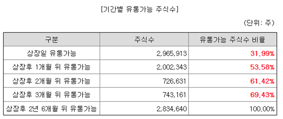상장 후 1개월 후 약 22% 물량이 추가로 락업해제되며, 총 54% 물량이 1개월만에 유통되는 구조입니다.