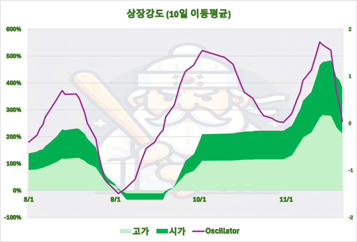 한번씩 돌려보는 시장의 강도 차트인데, 큐리오시스 상장 시점 즈음을 정점으로 하여, 상당히 내려와있는 모습입니다.
