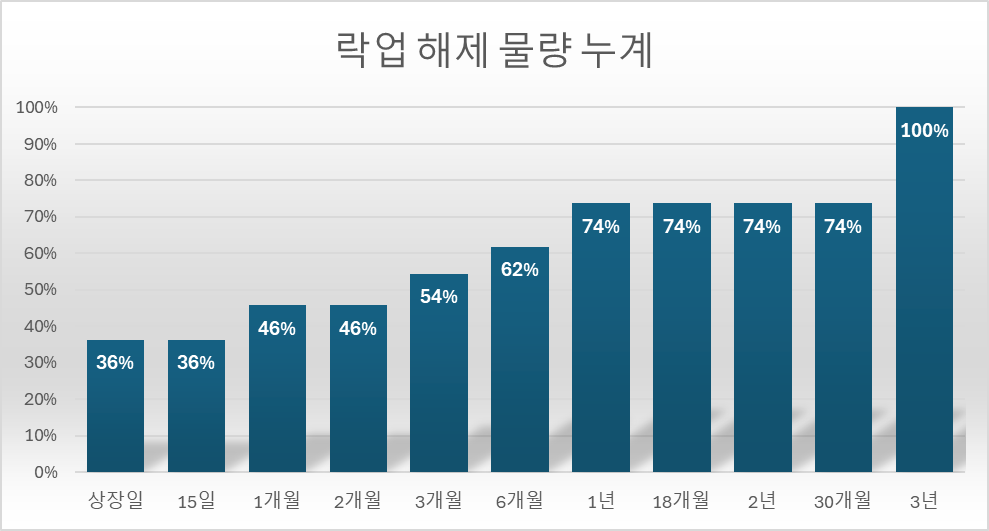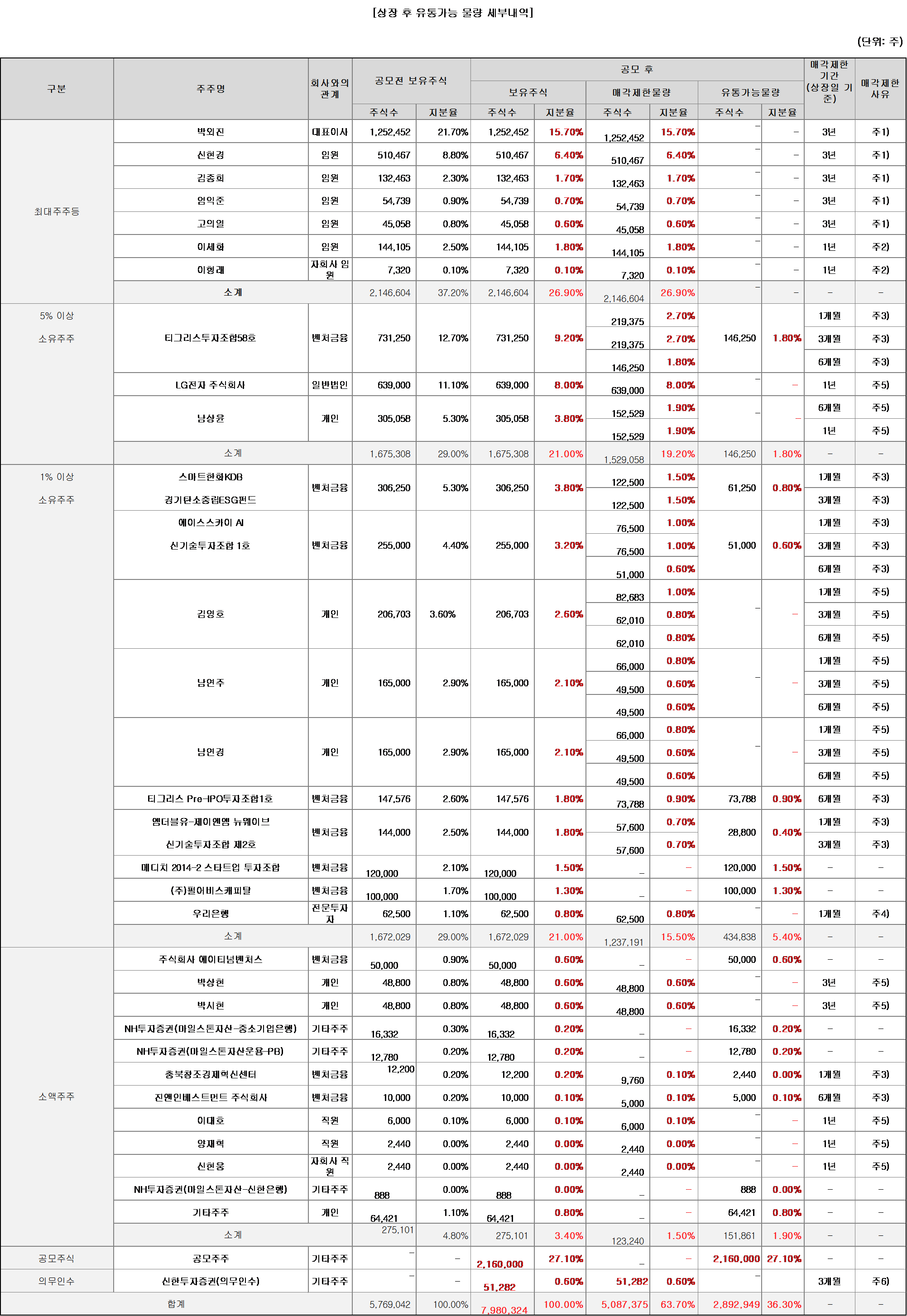 상장 후 1개월 후 약 10% 물량이 추가로 락업해제되며, 총 46% 물량이 1개월만에 유통되는 구조입니다.