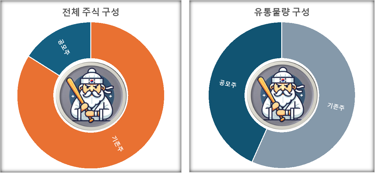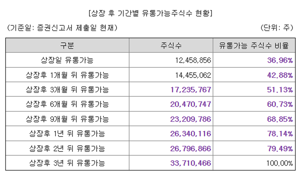 상장 후 1개월 후 약 6% 물량이 추가로 락업해제되며, 총 43% 물량이 1개월만에 유통되는 구조입니다.
