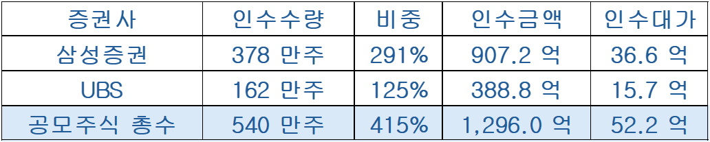 | 증권사 | 인수수량 | 비중 | 인수금액 | 인수대가 |