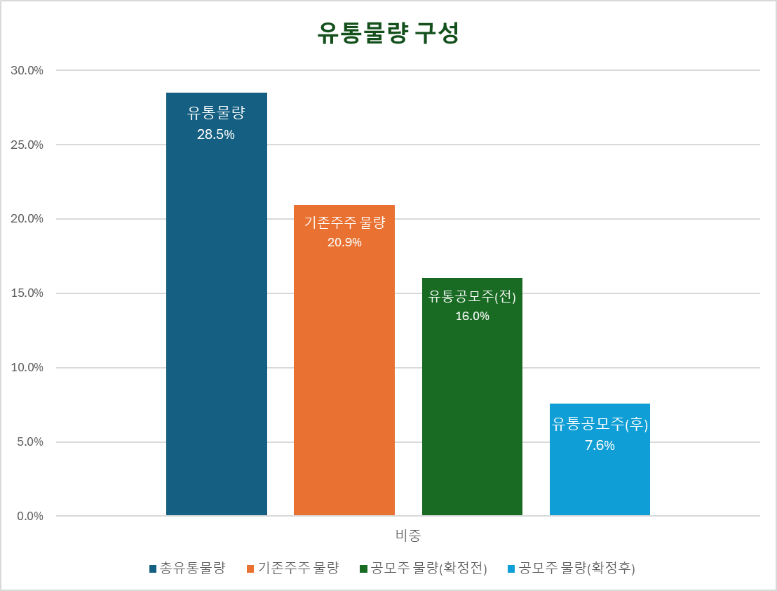 유통물량 약 28%는 기존주주 20.9%와 공모주주 7.6%로 구성됩니다