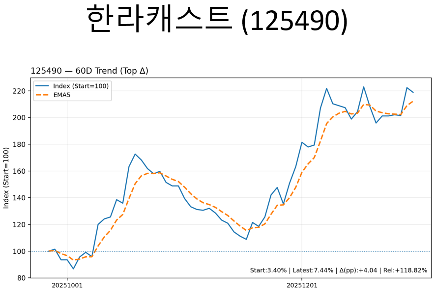 - 한라캐스트 : AI가 묻으면서 많이 올라왔습니다. 2개월 후에 10% 정도 락업 해제인데, AI의 강세는 유지되는 것 같습니다