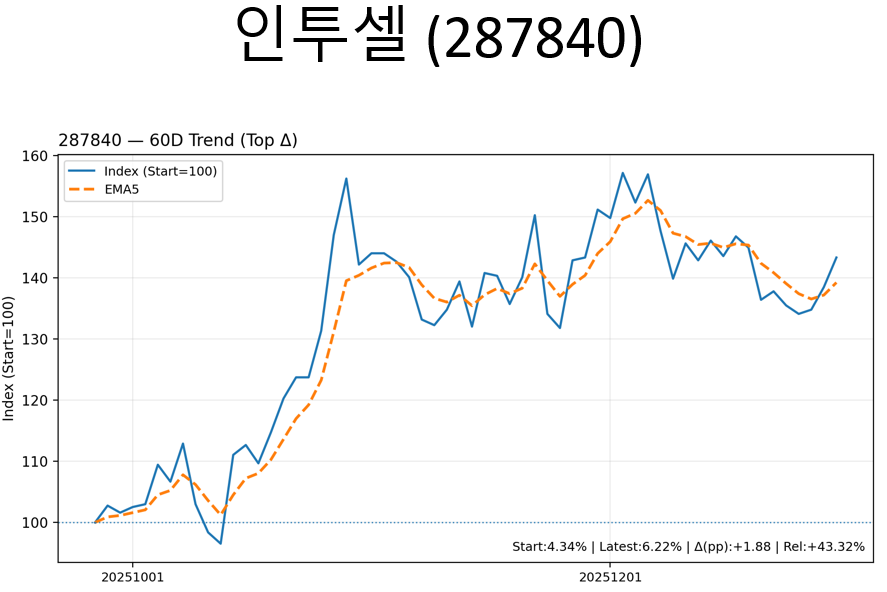 - 인투셀 : ADC 플랫폼의 힘으로 상승했다가, 힘이 빠지는 구간인데, 눌림목으로 보는지 주가보다 비중이 약간 더 증가했습니다
